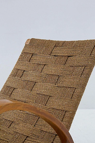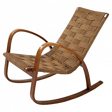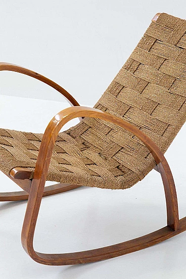 Rare rocking armchair of Italian manufacture from the Rationalist period of the 1920s. The armchair is placed in the European Bauhaus period. The armchair is well constructed with solid wood surrounding its surface. While the seat and back are a whole made of rope fabric. The armrests and legs are made of a single curved wooden shell. A great and very rare piece of Italian history, but at the same time a classic that never fades.