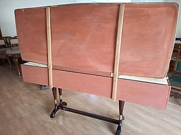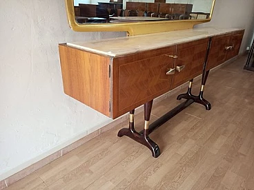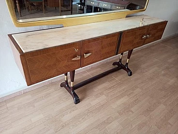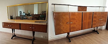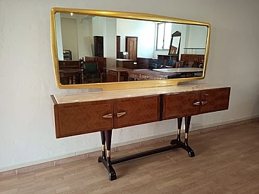 Pair of sideboards from the 1950s designed by Vittorio Dassi for Cecchini, a carpentry shop with offices in Lissone, Seregno and Cantù. One of them has a hardwood structure with brass details, gilt mirror, pink Portuguese marble top. It has recently been restored and is therefore in very good condition with minor signs of wear consistent with age; wooden parts have been polished with shellac, the sub-base of the central body has been renewed to bring it back to the original finish; marble is original and in perfect condition. It is 180 cm high, 224 cm wide and 46 cm deep. It weighs approximately 50 kg.