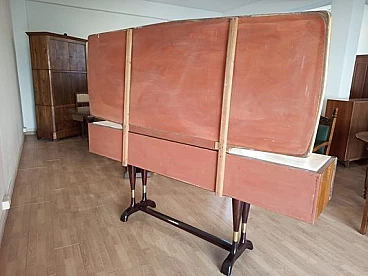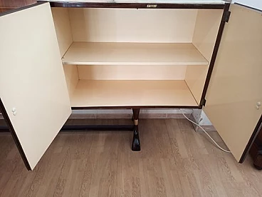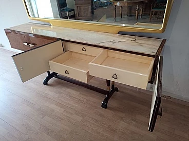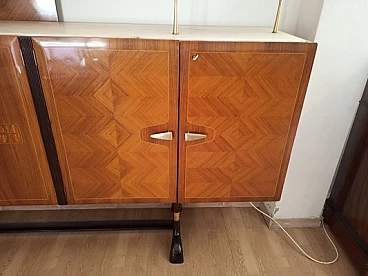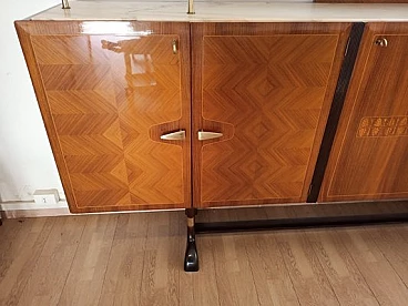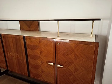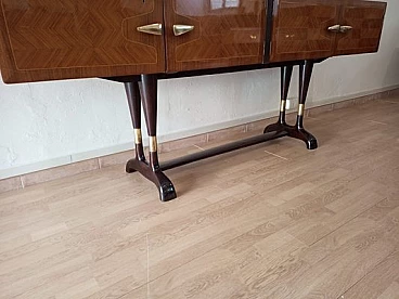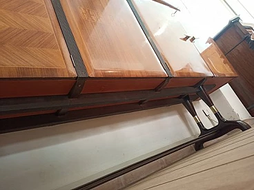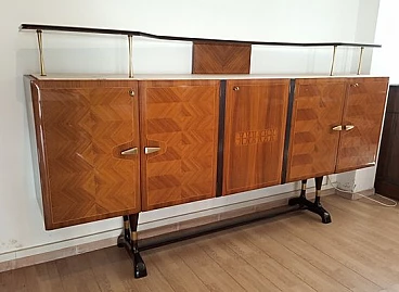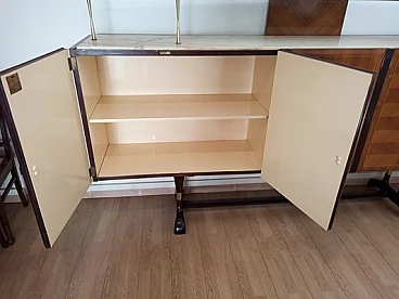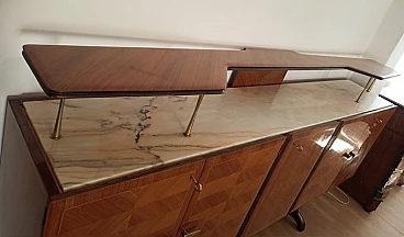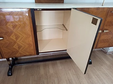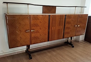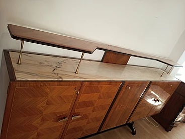 The other sideboard is made of wood with brass details, marble top and raised shelf; it is equipped with two pairs of hinged doors and a single central door which hides a space that can be used as a bar compartment. This one has also been fully polished and restored. It is 150 cm high, 278 cm wide and 50 cm deep.