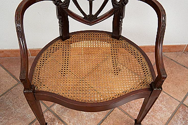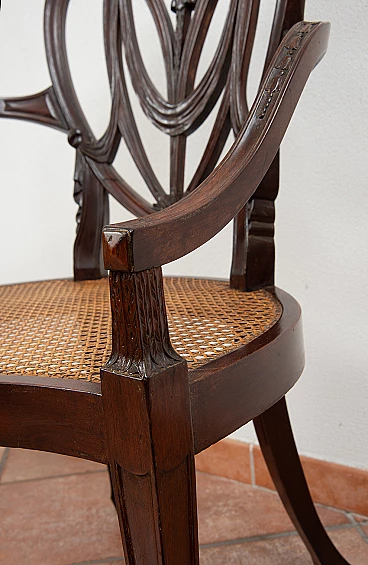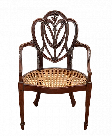 English solid mahogany armchair from the late 19th century. The sinusoidal backrest, with a floral element in the centre, is connected to the seat by armrests. The truncated-pyramid shaped feet are connected by a mixtilinear apron. The seat is made of Vienna straw. Origin England 19th century. Measurements 60 x 50 cm, H 97 cm. Certificate of Authenticity. We are at your disposal for further clarification or photographic details. Shipping throughout Italy, Europe and the rest of the world at very low prices, with maximum security and traceability. Shipping will be agreed privately. We wish you a good day.