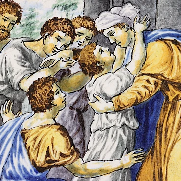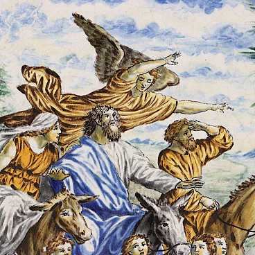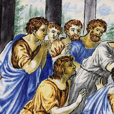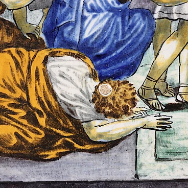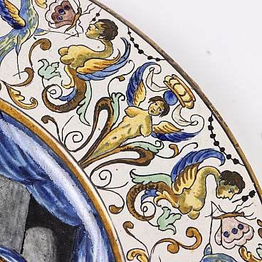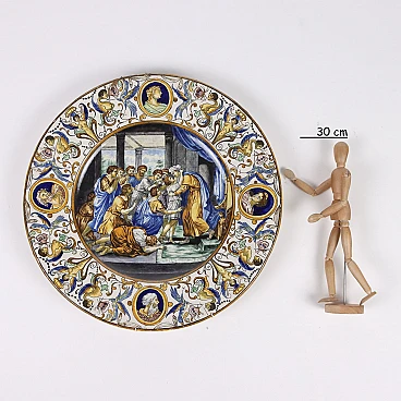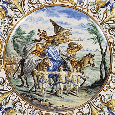 Pair of polychrome ceramic parade plates made in central southern Italy in the second half of the 19th century. Decorated with grotesques and medallions on the brim; biblical scene in the central part.