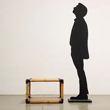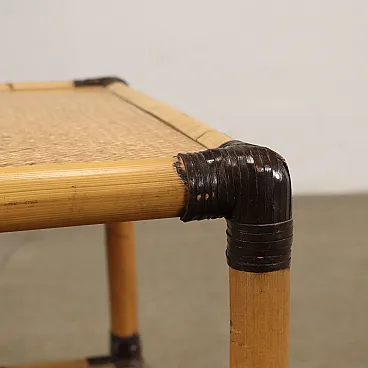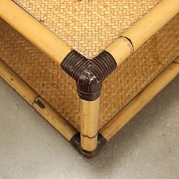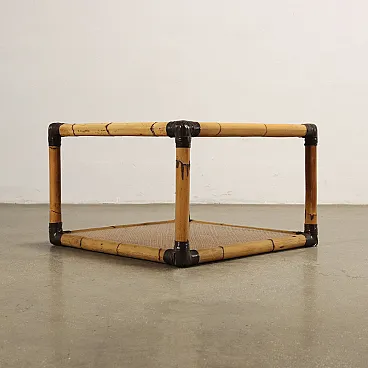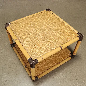 Square coffee table with double shelf, 1980s. Bamboo structure and wood shelves covered with woven drawn bamboo.