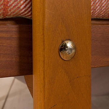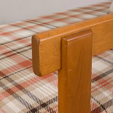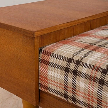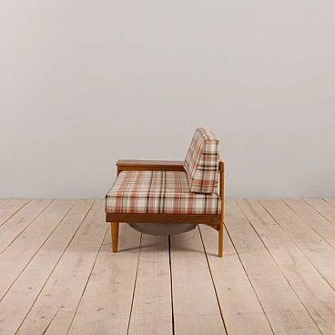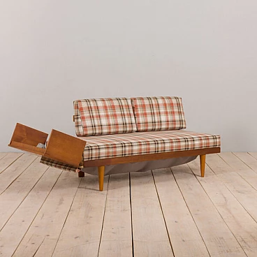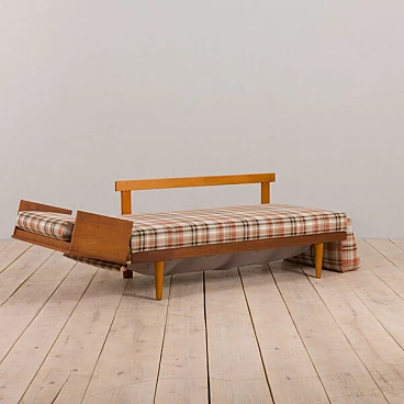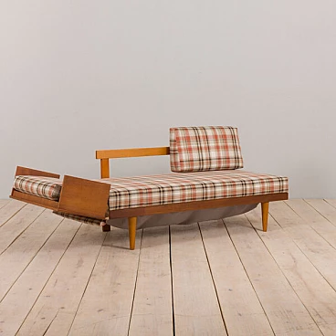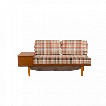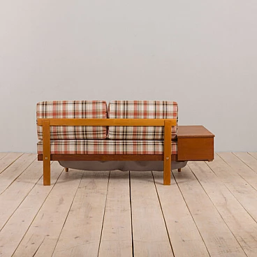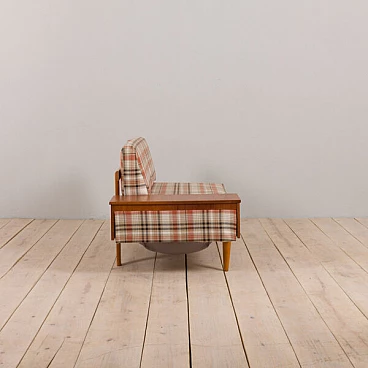 A welcoming and functional Svane daybed/sofa, designed by Ingmar Relling and produced by Ekornes in the 1960s/70s. This daybed is perfect for smaller rooms and the living room, as it has a sleeping function while being fully collapsible. It is also suitable for a home office space. The foldaway table is functional and offers space for a back cushion. It has a rest function when fully unfolded, and underneath there is a compartment for sheets and blankets. The pillows and mattress have been reupholstered in a stylish plaid fabric and the foams have been replaced. The day bed is in very good condition and measures 186cm in total length when fully opened. The wood has been preserved with additional layers of Danish oil.