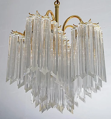 This chandelier has a brass structure with 6 lights and 60 Murano crystal Quadriedri of 20 cm; the height of the single chandelier, without the chain, is 47 cm. This model is very reminiscent of Venini's style. Diameter 40cm.
