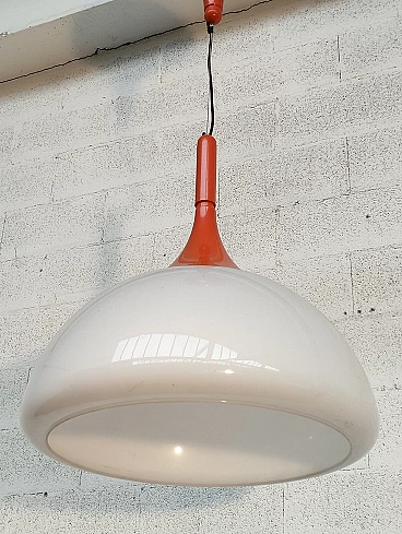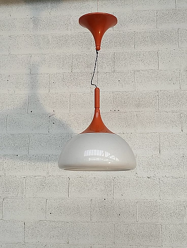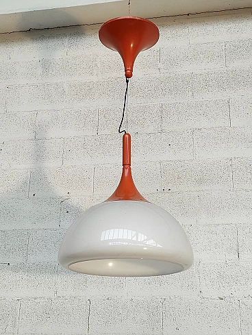 Orange pendant lamp by Elio Martinelli for Martinelli Luce, 1970s. Elio Martinelli was born on 19 November 1922. After a childhood and adolescence spent in Lucca, he studied set design in Florence where he graduated. Taking over the family business after the untimely loss of his father, he began a collaboration with a company in Lucca for which he designed interiors for public premises. He began to design and produce his own lamps for inclusion in projects. Thus Martinelli Luce was born, in a basement located in Piazza Bernardini in Lucca, with the few tools necessary for a small production. He married Anna in 1949 and together they began to participate in the most important trade fairs of the time, but it was with the first edition of Eurodomus in Genoa in 1966 and the meeting with Giò Ponti that Elio Martinelli and his company gained international prominence. In his professional life, Elio Martinelli designed many lamps and had to study new methacrylate moulding techniques to make some of them. We are in the 1960s, the era of the affirmation of innovative and revolutionary plastic materials, and it is precisely in plastic that the most representative lamps of his production were born. Attention to technology and novelty has always characterised Elio Martinelli's interest, not only in the materials the lamps were made of, but also in the use of new light sources. Starting in the 1970s, the classic light bulb was increasingly replaced by halogen and metal halide lamps that led to a real revolution in the lighting of commercial spaces. It was in the early 1980s when Elio Martinelli designed his first technical devices collected in a specific catalogue called 'Sistemi'. It was during these years that his daughter Emiliana joined the company, initially interested mainly in the graphics part. So we arrive at the 1990s, Martinelli Luce has a consolidated role in the panorama of lighting fixture manufacturers and, given the difficulties of the domestic market, is projected even more towards foreign markets and the lighting of large commercial spaces, also with productions dedicated to contract Elio martinelli passed away on 21 October 2004 after an illness that had forced him in recent years to stay away from that creature to which all his thoughts were nevertheless turned.