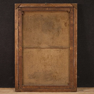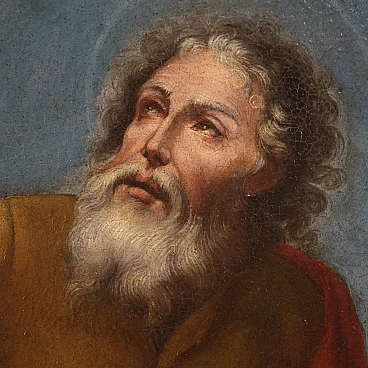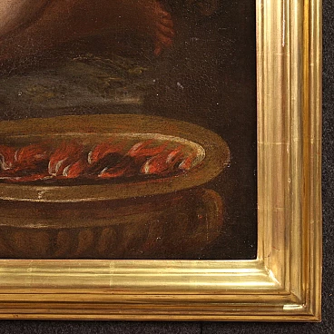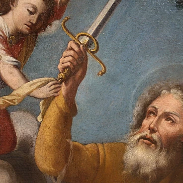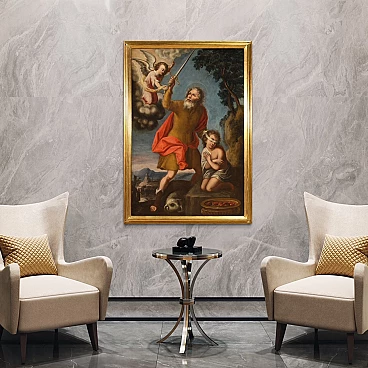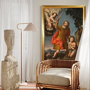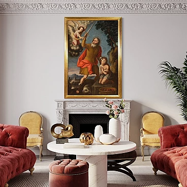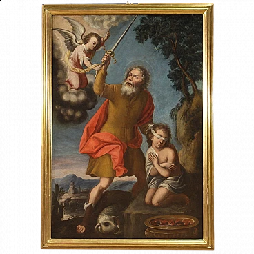 Antique Italian painting from the 17th century. Oil on canvas painting depicting biblical subject, Sacrifice of Isaac, of good painterly hand. Painting of great size and impact, adorned with finely carved and gilded 20th century wooden frame. God, in order to test Abraham's faith, orders him to sacrifice his own son Isaac. The painting depicts the moment when an angel of the Lord descends to block Abraham's hand and shows him a ram to be immolated as a substitute sacrifice. A painting of good luminosity, the blue background creates an interesting contrast with the bright colours of the robes. The painter also inserts a foreshortening with architecture in the bottom left-hand corner (see photo). First canvas painting that has undergone conservative restoration and colour restoration in some places (see photo). In good condition. Light painting H 153 x W 103 cm.