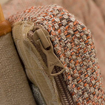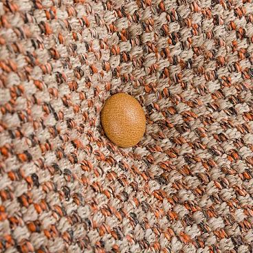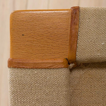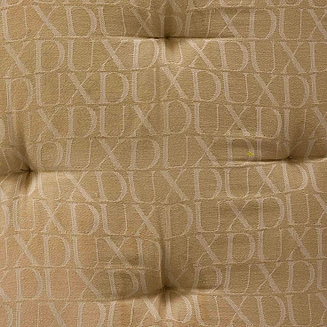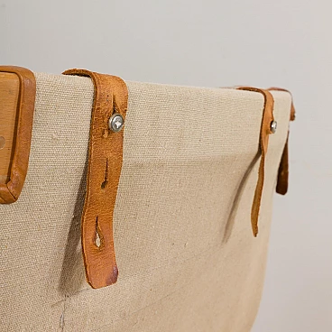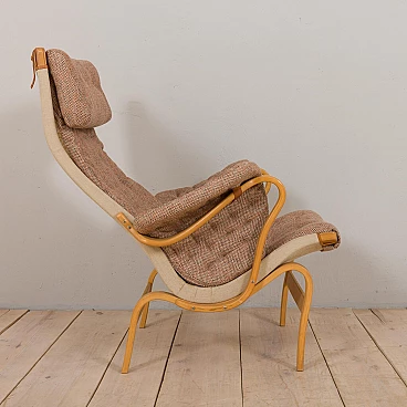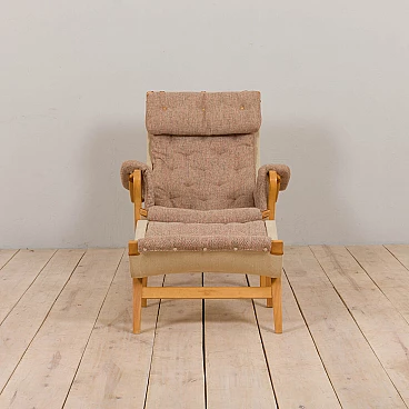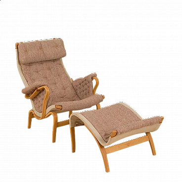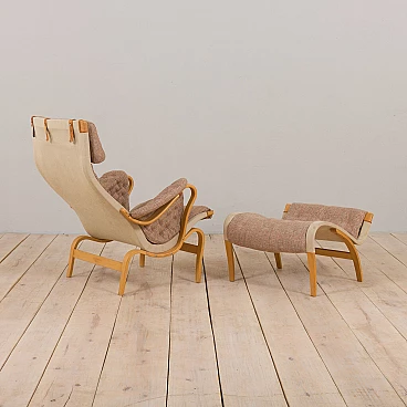 Pernilla armchair with footstool by Bruno Mathsson for Dux, made in Sweden in the 1960s. It is an improved version of the original model which dates back to 1944. The armchair has a minimalistic and organic design with a curved seat and backrest in combination with a practical footstool. Both are made of curved beech plywood, canvas and new natural cotton woven upholstery in shades of beige, orange and brown. Original Dux lining preserved. Wood and canvas in original condition with slight traces of use. The armchair is 99 cm high, 85 cm wide and 90 cm deep; the seat is 27 cm high. The footstool is 41 cm high, 62 cm wide and 73 cm deep.