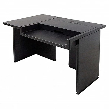 Eugenio Gerli and Osvaldo Borsani designed the Graphis desk system for Tecno, Italy, in 1968. The desk is part of a project for a modular system. This black desk is as simple as possible and is made of plastic with steel-metal feet and inserts. Graphis is a modular system based on the logic of a small number of highly versatile components that can be repeated and combined with each other: rectangular or round tops, support angles, panel bases, partition screens, storage units, shelves on tops and accessories for electrification. Notice the metal holes that allow the passage of wires, but also the small panel that opens to facilitate the disappearance of the double shelf. As can be seen, the double shelf can be removed to allow for the expansion of the desk and worktop. The absolute and elementary form of this system proposes a radical, democratic and undifferentiated interpretation of the office, offering maximum creative freedom for open and shared layouts. A universe of solutions made up of clean cuts, right angles, flat surfaces, dedicated to interior architecture solutions where formal rigour and cleanliness are linked to functionality and optimisation of space. The formal purity and infinite possibilities make the system perfect for work and meeting spaces, executive offices and home-office environments.