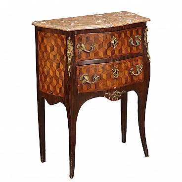 Bedside table with pink marble top, front with two drawers and wavy sides. Inlaid decoration of various woods with marquetry motif, ornamental bronzes and wavy legs. Interior in oak.