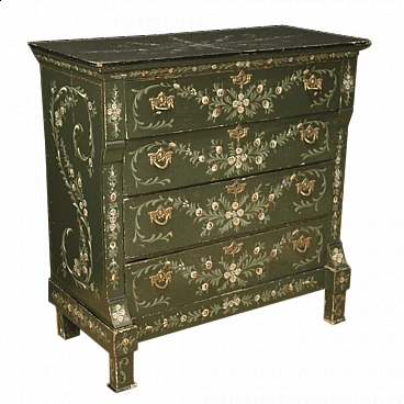 Dutch dresser from the first half of the 20th century. Beautifully designed and pleasant furniture in lacquered wood and hand painted with floral decorations. Chest of drawers with four drawers of good capacity and wooden top in character also lacquered and painted. Dresser ideal to be placed in a bedroom or living room, for antique dealers and interior decorators. In beautiful patina, it has some drops of color, overall in good state of preservation.