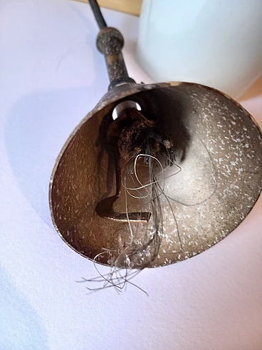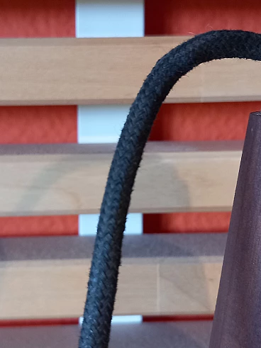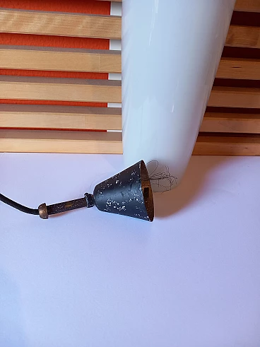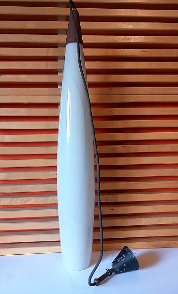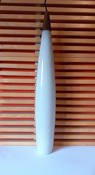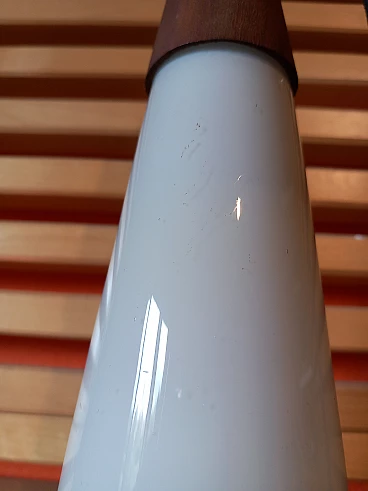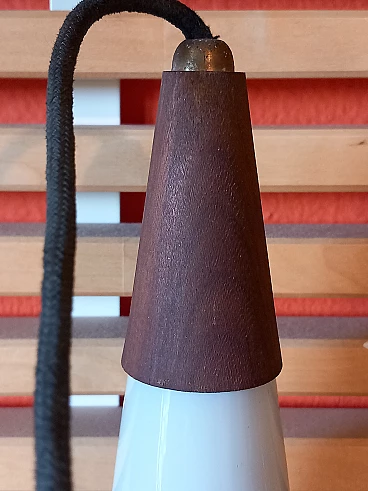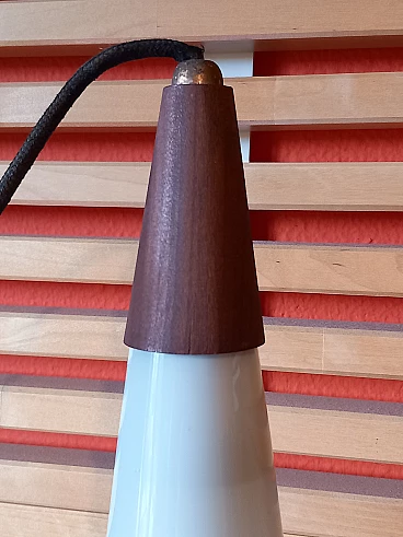 Hanging lamp by Alessandro Pianon for Vistosi, 1950s-60s. Light diffuser in "incamiciato" milky glass showing the characteristic bubbles of Murano workmanship; conical screwing in rough teak. It may need wire replacement. Total height: 153 cm. Height without cable: 65.8 cm.