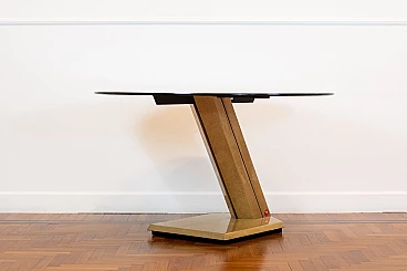 Sunny pedestal table with a wooden frame and round smoked glass top, designed by Giovanni Offredi and produced by Saporiti in the 1970s. Giovanni Offredi was an important Italian furniture and product designer of the second half of the 20th century. Unlike most other Italian furniture designers of his time, Giovanni Offredi was not an architect, nor did he start designing at the beginning of his professional career. Instead, Offredi fits partially into the career path of some talented contemporary designers who pursue product design outside of a formal education in architecture.
