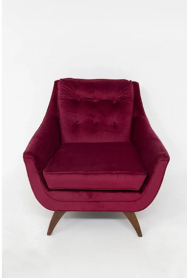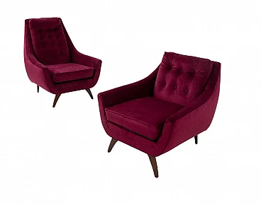 Elegant pair of Adrian Pearsall armchairs from the 1950s. The couple is part of a duet called: Lui e Lei, in fact the different dimensions of the couple are indicated. The tallest armchair of the 1950s was intended for men, while the lowest one for women. Both are upholstered in an elegant burgundy-purple velvet.