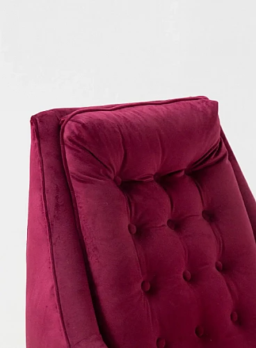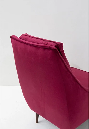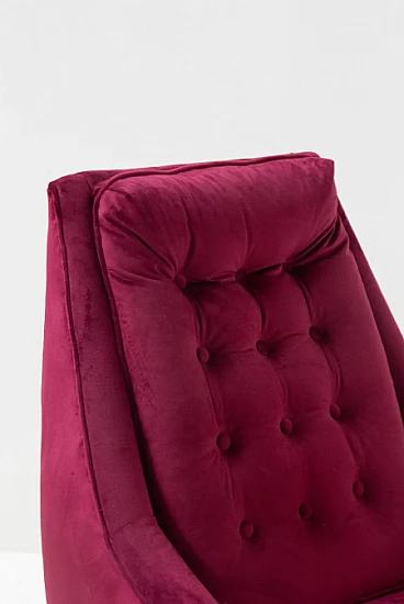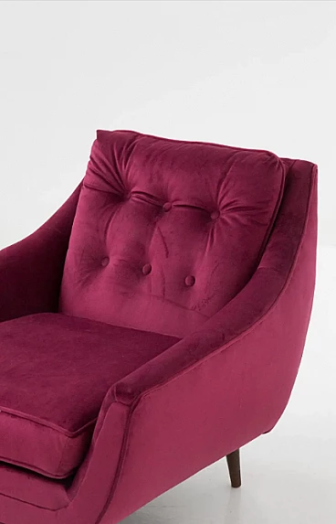 Note the rear feet curved inwards, while the front ones have the typical shape of the 1950s, i.e. conical in wood. Both armchairs have two seat cushions and two back cushions, both with button tufting.