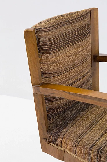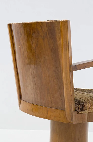 Rare armchair of Italian Rationalism from the 1930s attributed to Piero Bottoni. The armchair is a great product of Italian design from the 1930s. Through its rigorous and geometric lines, typical of Italian Rationalism, the armchair transmits rigor and solidity to the observer. Made of noble wood, the armchair is presented in the original conditions of the time, in fact it still retains the original cotton fabric worked in various colors. Its base is made up of a single block: a pedestal with a round base that supports the entire structure, creating a clear-cut geometric game. The backrest, also in the same wood, has clean and geometric lines, where the rigor is one with the seat. The last detail of the armchair is its swivel mechanism which allows the seat to turn in all directions. Of great quality and beauty, the armchair is ideal for classic environments or for the great collectors of Italian design.
