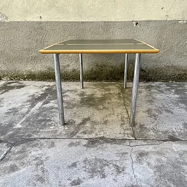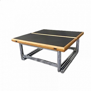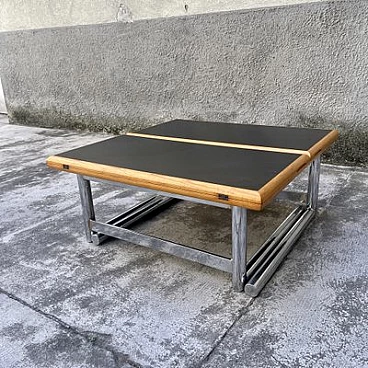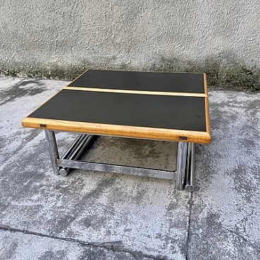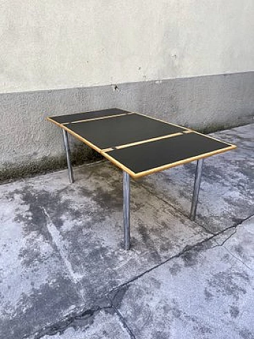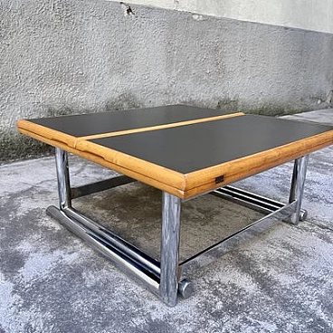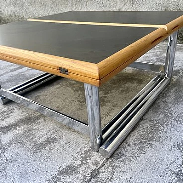 This very special square table, fitted with solid steel legs, can be transformed into a large dining table by simply lifting it up so that the legs, when opened, raise the top to a dining table. Then simply open the top, obtaining a top of 180 x 90 cm. The supporting structure is made of solid chrome-plated steel, while the top is made of wood with black laminate inserts, creating a sober colour combination suitable for any environment.