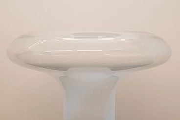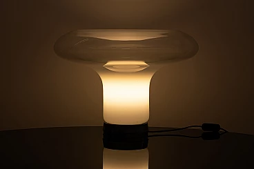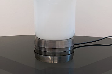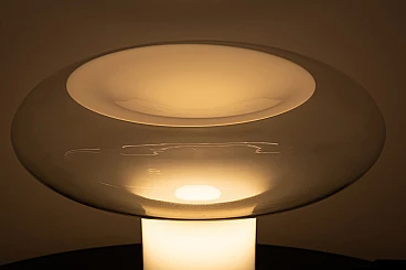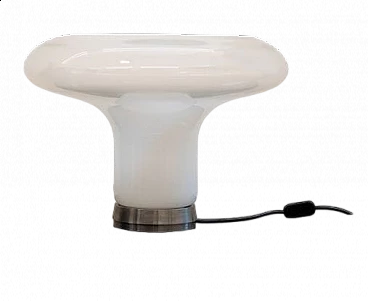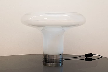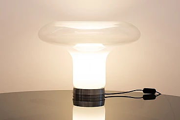 Lesbo table lamp by Angelo Mangiarotti for Artemide, 1960s (1966). Polished metal base and light diffuser consisting of a single hand-blown Murano glass element. Manufacturer's mark imprinted under the base. The shape of the diffuser and the peculiar white-transparent shades of the glass are obtained thanks to the skill of master glassmakers. The diffused light emitted by this lamp is perfect for creating an elegant and relaxing atmosphere. Angelo Mangiarotti was born in Milan on February 26, 1921. He graduated in Architecture in 1948 from the Milan Polytechnic. From 1953 to 1954 he worked in the United States; here he met Frank Lloyd Wright, Walter Gropius, Mies van der Rohe and Konrad Wachsmann. Once back, he opened an architectural firm together with Bruno Morassutti until 1960. In 1989 he founded Mangiarotti & Associates Office based in Tokyo. From 1986 to 1992 he is art director of Colle Cristalleria. In addition to his career as an architect he has an intense teaching activity carried out in several Italian and foreign universities: in 1953-1954 he is a visiting professor at the Institute of Design of the Illinois Institute of Technology in Chicago; in 1963-1964 he teaches a course at the Istituto Superiore di Disegno Industriale in Venice; he is a visiting professor at the University of Hawaii in 1970, at the Ecole Politecnique Fédérale in Lausanne in 1974, and at the University of Adelaide and the South Australian Institute of Technology in Adelaide in 1976; in 1982 he was an adjunct professor at the Faculty of Architecture in Palermo; in 1983 he was an adjunct professor for the composition course at the Faculty of Architecture in Florence; in 1989-90 he was an adjunct professor in the graduate course in Industrial Design at the Faculty of Architecture of the Milan Polytechnic. He participates in numerous international seminars and conferences. In his design activity, whose theoretical foundations are expressed in the book "In the Name of Architecture" published in 1987, he wants to highlight the essential characteristics of each object. Architectural language becomes the expression of a new relationship between man and the environment. In his activity as a designer, Mangiarotti gives a very important role to plastic research; the objective of his research, always conducted with respect to the characteristics of Matter, is the definition of the Form of the object as a quality of Matter. Mangiarotti died in Milan on June 30, 2012.