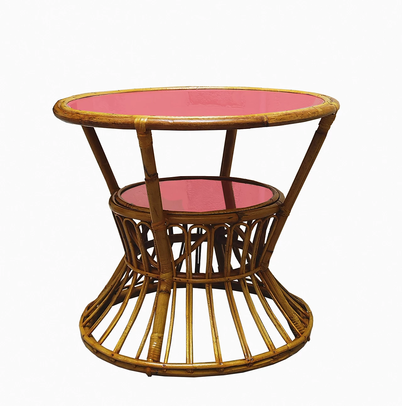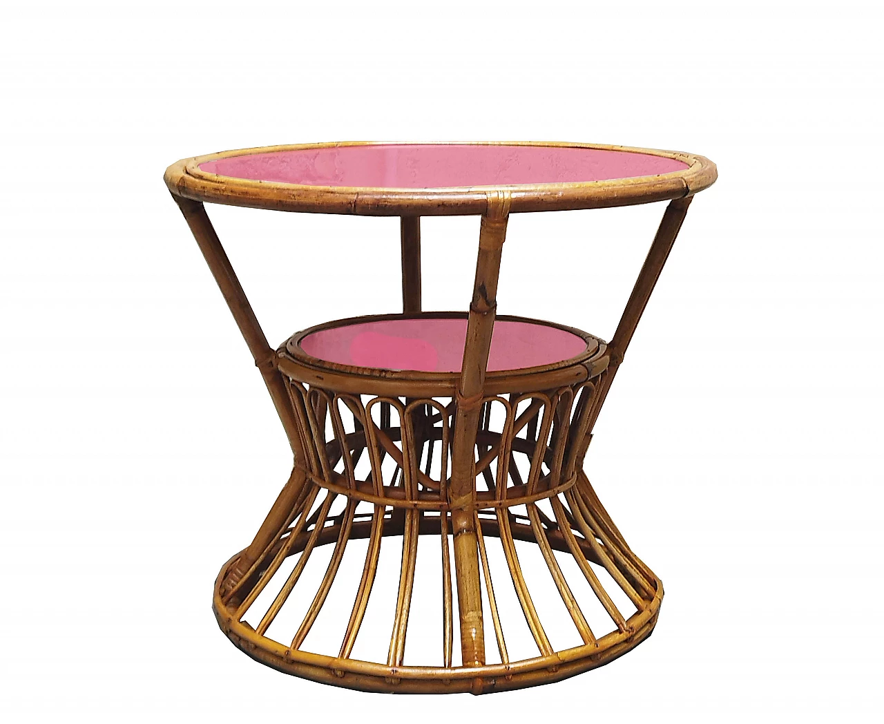 Round coffee table with double shelf by Tito Agnoli, 1960s. Rattan and bamboo structure, red glass shelves.