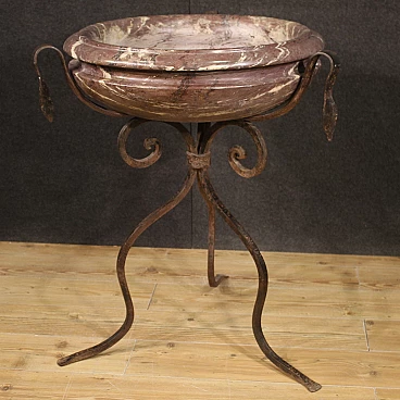 Early 20th century Italian planter. Object composed of wrought and chiselled iron base and sculptured marble basin of exceptional quality. A piece of furniture of beautiful size and proportion, easily placed in different parts of the house, ideal for a living room or entrance hall, for antique dealers and interior decorators. Mobile that can be used both as a planter and as a piece of furniture, in fabulous patina. Structurally sound and sturdy iron tripod support with signs of wear that add to the furniture's charm (see photo). In good condition with some signs of time.