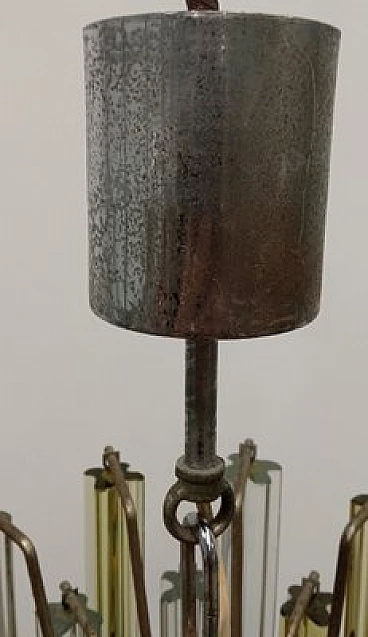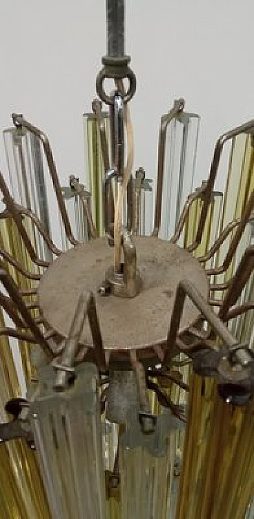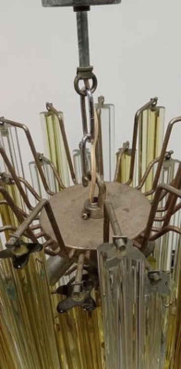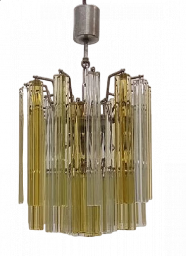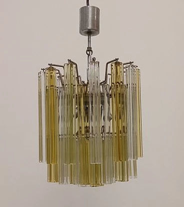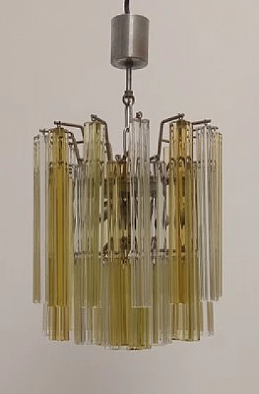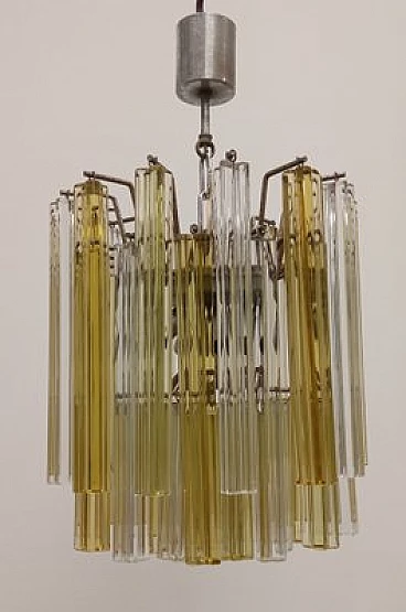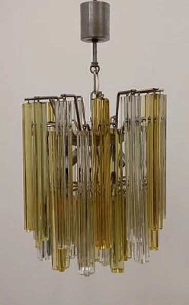 Two-tone Murano glass chandelier, 1960s. Handcrafted by alternating on several levels four-lobed elements of two sizes and colors, transparent and straw yellow. It has four original E14 lamp holders suitable for LED and filament bulbs. The chandelier is in the condition of the find: it was in use and working but replacement of the electrical system is recommended (on request this can be done directly by the seller).