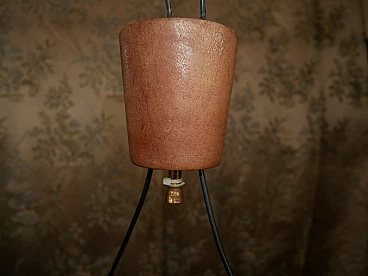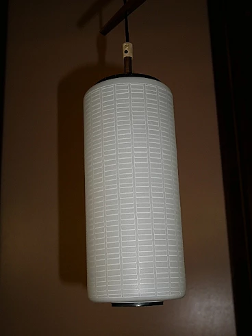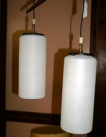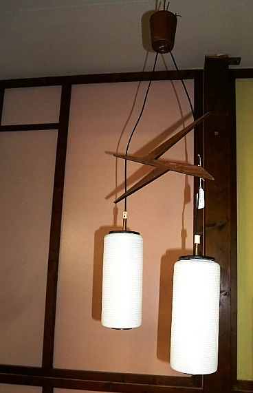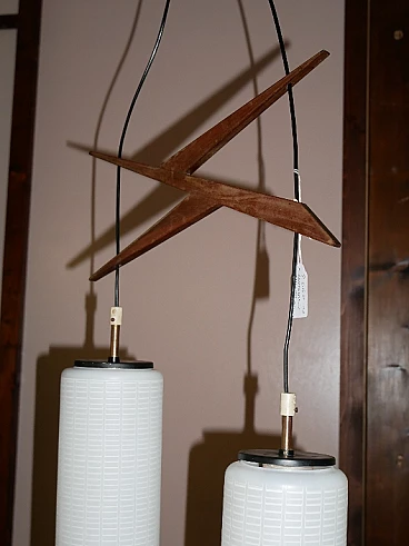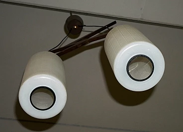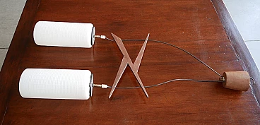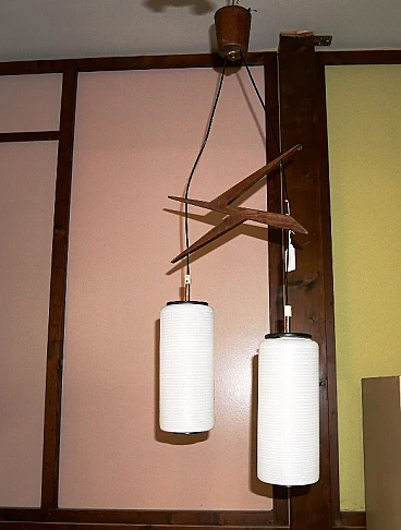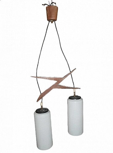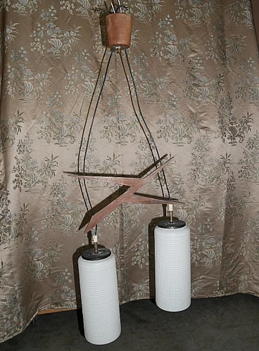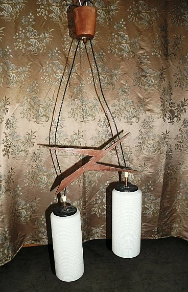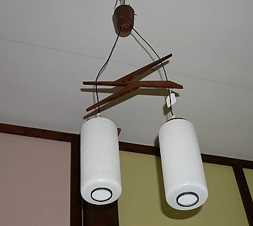 1960s Italian modern antique chandelier. Teakwood structure with two cylinders in milky glass and black electrical wires supporting them, two E14 lampholders. Black sheet metal base. Working chandelier in good overall condition. Original from the period, not restored. Slightly worn, yellowed paintwork. Height 100 cm, width 36 cm,