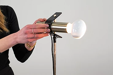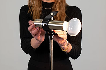 Floor lamp model 399 (from Cornalux series) with structure in nickel-plated metal, lacquered metal and cast iron. The lamp bulb is adjustable in height achieved by a bracket that allows the lamp to be slid up and down the lamp stem. This lamp was designed by the Italian duo formed by Angelo Ostuni & Renato Forti and manufactured by O-Luce in 1958. Measurements: H 141 x Ø 24 diameter (base 20cm). Founded in 1945 by Giuseppe Ostuni, Oluce is the oldest Italian design company still operating in the lighting world, a unique production excellence which translates passionate aesthetic and technological research into the potential of light into actual form. Over the years, Oluce has succeeded in building a collection structured like a tale, rich and multifaceted, inhabited by products that transcend fashion to become Italian design icons. Its relationship with the design world begins in 1951, Oluce successfully took part in the IX Triennale, presenting – in the lighting section curated by Achille, Livio and Pier Giacomo Castiglioni – a Luminator designed by Franco Buzzi. As was typical at that time, the company instantly gained visibility on the international panorama thanks to Domus magazine. Major success was then reasserted by Tito Agnoli with nominations at the second edition of the Compasso d’Oro awards, in 1955, for his two lamps (the 363 floor lamp and a special bookshelf model). In 1956 these were followed in rapid succession by two more nominations: one for a remarkable table lamp in polyvinyl slats and another for a pendant lamp (mod. 4461) with double perspex shade. Then, there was the noteworthy 255/387 lamp (known as ”Agnoli”), a spot light supported by a slender stem, which in 1954 marked the decline of lampshades and the adoption of highly simplified floor lamps even for home lighting.