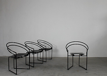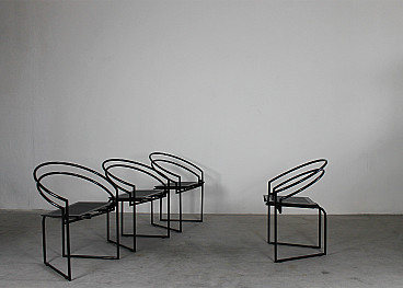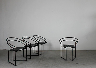Set of four dining chairs La Tonda with a black lacquered steel rod frame, seats and backs in bent perforated sheet metal. Designed by Mario Botta for Alias 1980s Italy. Mario Botta was born in 1943 in Mendrisio. After working as an apprentice draughtsman for the Lugano-based architect Tita Carloni, he moved first to Milan and then to Venice, where he enrolled at the department of Architecture at the IUAV. He completed his degree in 1969 with a thesis tutored by Carlo Scarpa – after having met Le Corbusier and Louis Kahn, who were later to be sources of inspiration – and returned to Switzerland to open his own professional firm, which at the time dealt mainly with detached family private homes. These included the villas in Riva San Vitale (1971-1973), Ligornetto (1975-1976) and Morbio Superiore (1982-1983), in which Botta treated the theme of the home as a refuge, which protects and reassures its inhabitants. These were buildings with a character that was ironic and, in a certain sense, monumental, obtained for example (in the case of Morbio) through rigorous symmetrical compositions and a particular use of raw concrete blocks set in a linear pattern and alternated with strips of silvered brick which, on the contrary, were set at 45 degrees. Partially dug into the hillside, the villa was also characterised by a theme which was particularly dear to Botta and which had already been explored in Riva San Vitale; the net distinction between solids and voids, the latter appearing to have been dug out of the building. Between 1980 and 1990, Botta associated with artists and intellectuals from all walks of life and took numerous long trips abroad. Together with Gabriele Basilico and Edoardo Sanguinetti, he published “La Casa Rotonda”, and he became friends with Max Huber, Nicki de Saint Phalle, Dante Isella, Harld Szeemann, Robert Frank and Alberto Flammer. In 1986, the MoMA in New York dedicated a solo exhibition to his work, and the Swiss architect received his first contracts for public buildings and from abroad, debuting with the Cultural Centre in Chambéry (1984-1987). In Japan, on a challenging triangular lot of only one hundred and sixty square metres, a space which remained from the opening of a new highway, Botta built a small building which, with its clarity and strength of image, attempted to stand out in the midst of the chaos that surrounded it, thanks to a thick masonry curtain raised on the main façade, in which slabs of grey marble are crossed with horizontal fissures which erode the angles and cancel the perception of the number of floors which make up the museum. The church of Mongo, on the other hand, was the first step in a long series of places of worship, including designs for the churches of Pordenone (1987-1992) and Sartiana (1987-1995), for the cathedral of Evry (1988-1995), for the basilica of Santa Maria degli Angeli on Mont Tamaro (1990-1996, for the Giovanni XXII church in Seriate (1994-2000) and for the Cymbalista synagogue in Tel Aviv (1996-1998). In each of these, light plays a predominant role as a prime generator of space and a measure for the definition of time that passes with the various phases of the day, the months and the seasons. Light is, however, the main symbolic element, representing through its variations the uneasiness of humankind in the face of divine perfection. In this same period, the scheduling for the construction of a new School of Architecture, the Mendrisio Academy, took place. Inaugurated in 1996, it offered an alternative approach to teaching in contrast to the Swiss University system, in which an important role is played by humanistic subjects and by a copious group of well-known international professors: from Rykwert to Benevolo, Burkhart, Campos Baeza, Dal Co, Frampton, Mendes da Rocha and Zumthor. Recently, Botta’s activity – as with many other archistars – has moved towards the Far East, thanks to projects such as the Leeum – an art museum sponsored by Samsung which was completed in Seoul in 2004 – the hotel Twelve in Shanghai (2006-2012) and the two headquarters for Tata in India (1996-2003). With the completion of the Mendrisio Academy campus, construction began for the “Theatre of Architecture”, which opened in 2018. Along with his activity as an architect, Botta also works – less intensely – as a designer, for example designing the Quarta chair (1984) and the Terzo table (1983). The Swiss architect is also credited with the setting up of the BSI Architectural Award, financed by the BSI Bank of Lugano, which is presented to designers under the age of fifty.