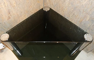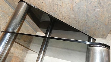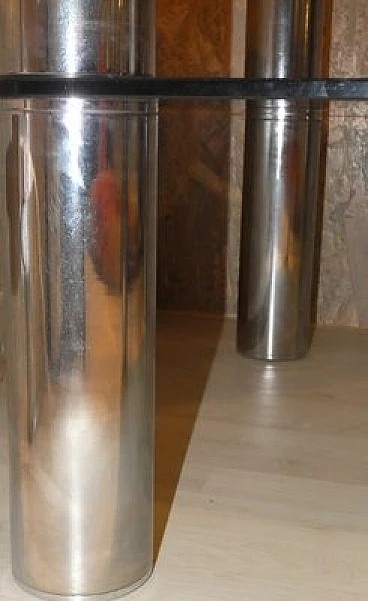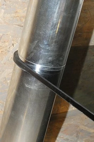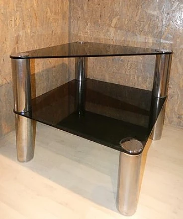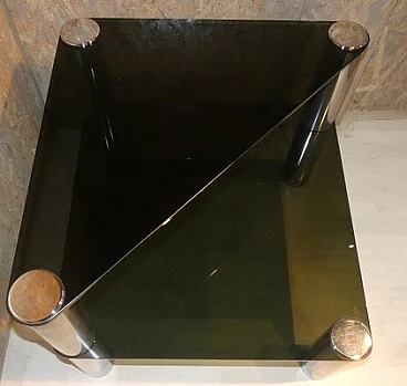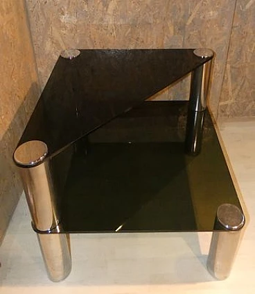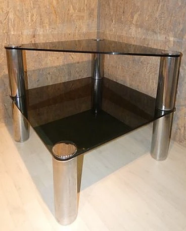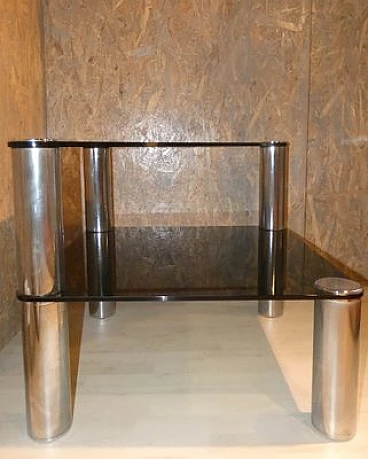 Produced by Zanotta in the 1960s, the 'Marcuso' coffee table has two shelves and legs in 18/8 stainless steel combined with an anthracite coloured glass top.
