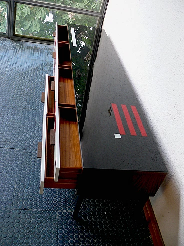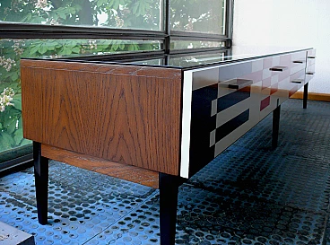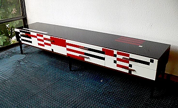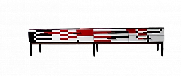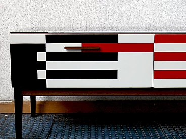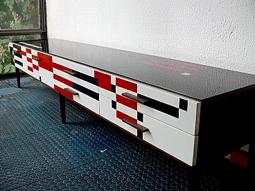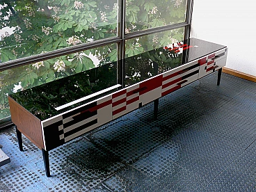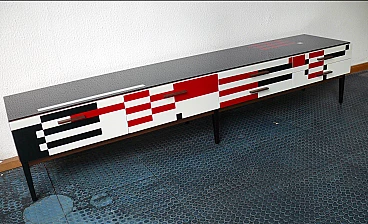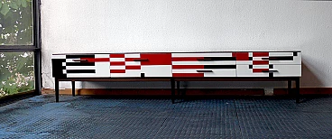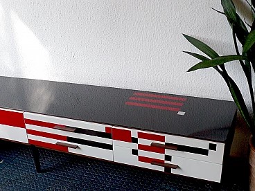 This low, long sideboard was made in Germany in the 1970s. The front of the cabinet consists of drawers decorated with hand-painted paintings referring to the Bauhaus style in off-white, red and black. The handles are made of solid oak, stained like the entire cabinet in a dark, cold brown. Their shape emphasises the graphic motif. Sideboard covered with a black glass top with a handmade motif on the front. The cabinet is heavy and stable, mounted on thin black solid oak legs, which give it lightness.