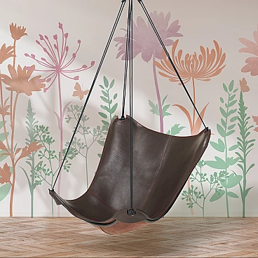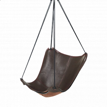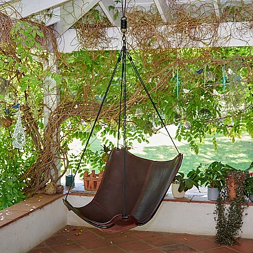 Leather Butterfly hanging armchair. This model is a classic that has stood the test of time for more than 80 years; its history is one of transformation, adaptability and evolution, making it an icon in the world of furniture design. Originally designed in the 1930s, the Butterfly Chair was a static floor model beloved for its unique shape and comfort. Now it has spread its wings and taken flight as a rocker, embodying the freedom it has always represented; it is free to hover and sway, becoming a playful and dynamic element to add to any space.