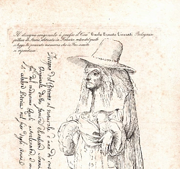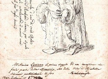 The sheet reproduces a drawing believed to be an autograph by Elisabetta Sirani (Bologna 1638 – Bologna 1665) at the time kept in the Cav. Carlo Ernesto Liverati, a Bolognese history painter but resident in Florence, as we read engraved in the upper part of the plate. In the composition we see an elderly woman moving from right to left; eyes wide open, aquiline nose and face furrowed by wrinkles, she is wrapped in a dress that is too large for her build. A wide-brimmed hat rests on long, messy hair. The inscription on the back of the drawing is engraved on the plate: "Portrait from nature of one of the Riali family, original by the famous Elisabetta Sirani, for whom she was poisoned by Reali himself, and a famous painter was missing in her prime" . Elisabetta Sirani was in fact poisoned by a house servant. On the sheet, in the lower white margin, a handwritten dedication in pen by the author: "To my friend Luciano the first essay of an engraving that will be part of the Memoirs, who will publish his Michelangelo on the life of Elisabetta Sirani. 1841. Bologna 15" . The reference in the dedication is to the volume actually published by Michelangelo.