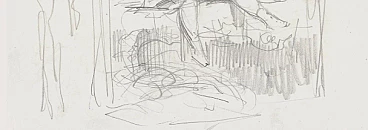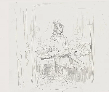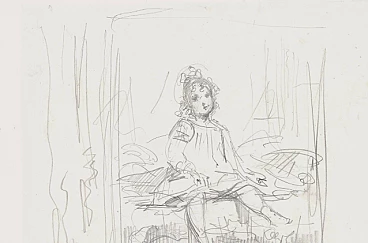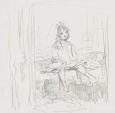 In this sheet, the artist shows the viewer the inside of a little girl's room, the scene is enclosed between two curtains that almost create a theatrical backdrop. With an immediate sign, the author reproduces a scene of family intimacy from life. The little girl is sitting on the bed, perhaps she has just woken up, her lively and frontal face seeks the viewer's gaze. The strength and essentiality of the stroke with which the furniture is designed contrasts with the care and sensitivity with which the expression of her face is rendered. The drawing, of remarkable mastery and freshness, is attributed to the French sculptor according to the indications present on the old assembly, now lost.