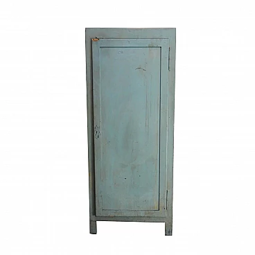 Small industrial armoire made in Italy in the 1970s. Light blue wood with one door, 2 hangers and central coat rack.
