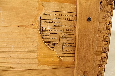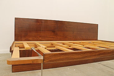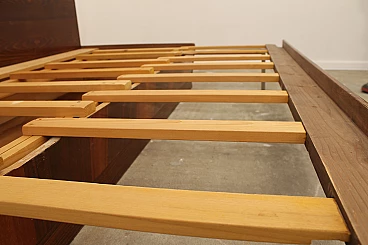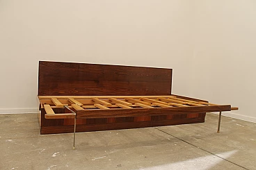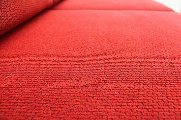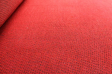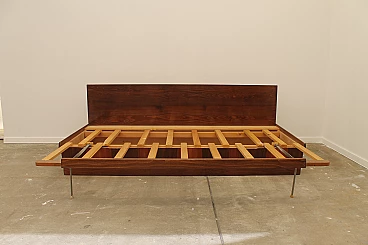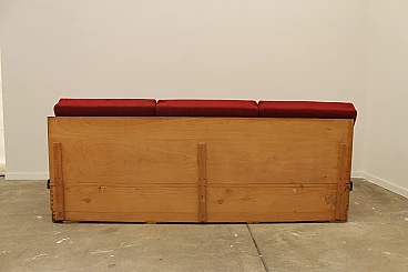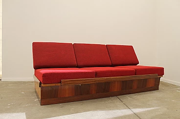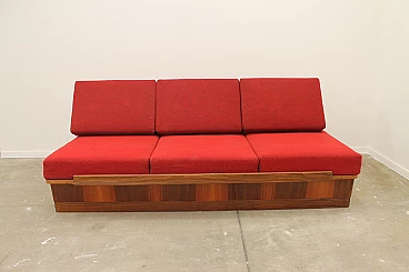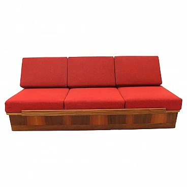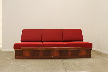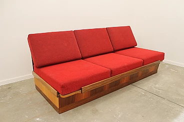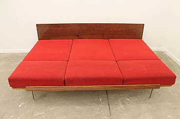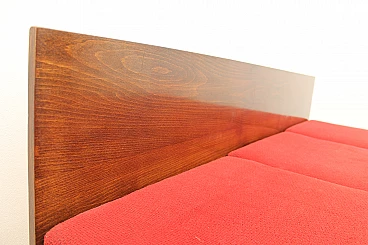 Folding sofa bed by Mier, made in the former Czechoslovakia in the 1960s. Walnut veneered wood structure, red fabric upholstery. It shows slight marks due to age and use. Seat height: 39 cm. Sleeping surface: 196 x 128 cm.
