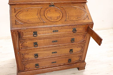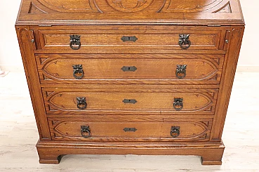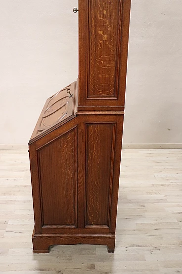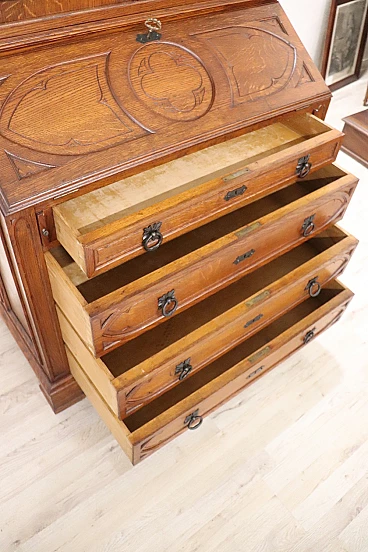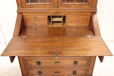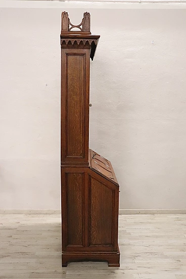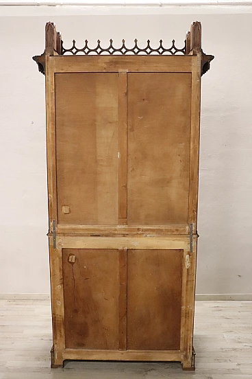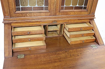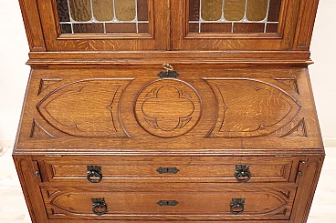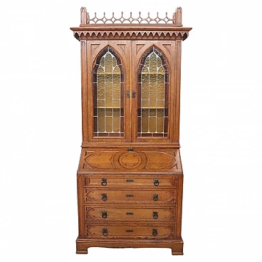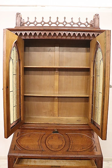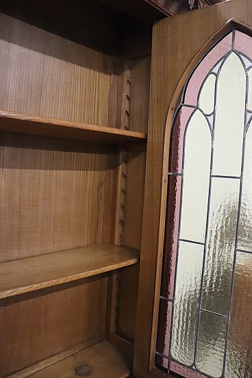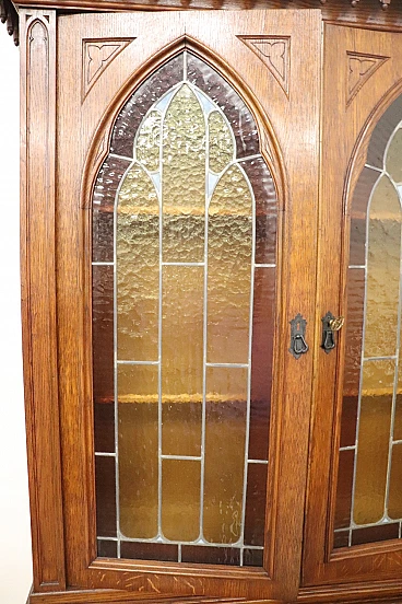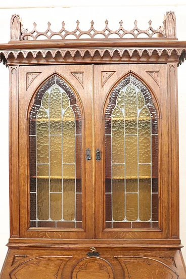 Characterized in the upper part by a majestic carved architectural decoration enhanced by two doors with cathedral stained glass. Internally, the upper part has two shelves that can be moved to the desired height. In the lower part, instead, are four drawers and a flap that converts into a convenient writing space equipped with six small drawers inside.