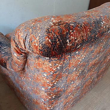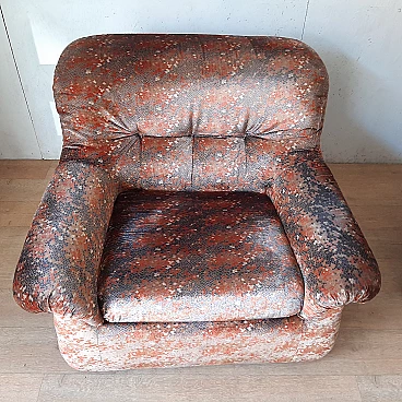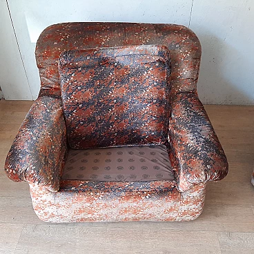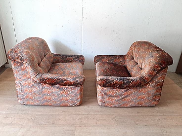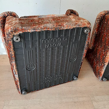 Pair of original 1970s Mimo J. Padova branded armchairs. Very comfortable and well preserved, light to move. The fabric, which is very unusual, is the original of the period and does not show any breaks. However, the fact remains that it has been used so it shows normal signs of use.