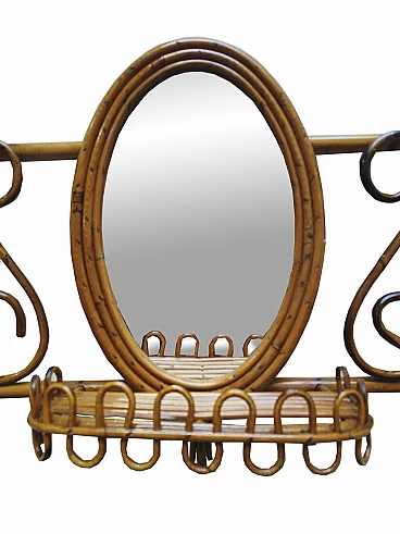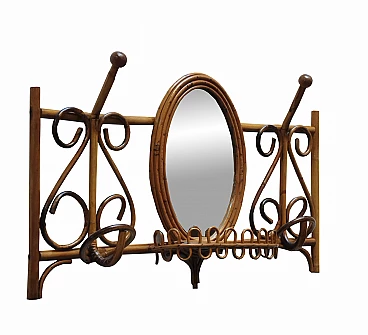 Bamboo and rattan wall coat rack with mirror, 1960s