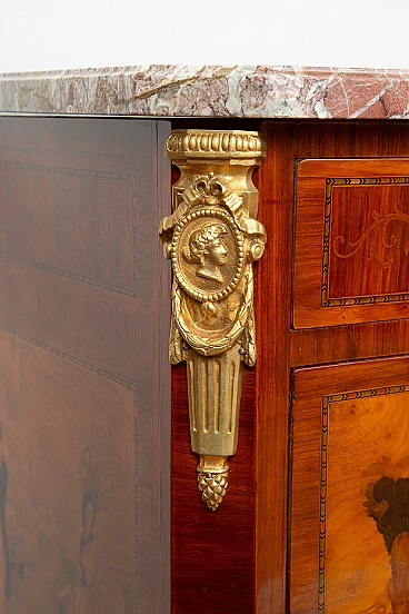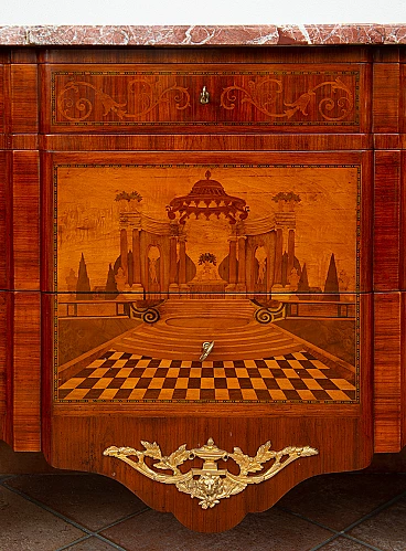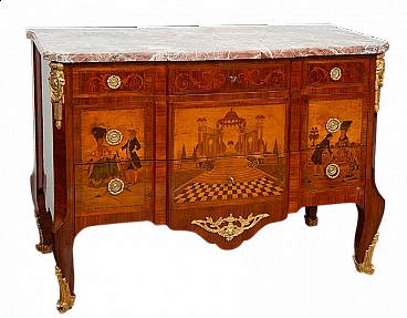 Two-and-a-half-drawer chest of drawers with a structure panelled in exotic woods and inlaid with precious woods surmounted by a marble top of the same period. The front is marked by two large drawers and a smaller one, arranged in three tracks, both graphically underlined by two rounds of threading. A beautiful inlaid reserve frames the two large drawers with a beautiful medallion in the centre depicting architecture in perspective surrounded by two gallant scenes with ladies. The band under the top is enriched by a dense inlay with a motif of racemes and flowers. Laterally, it shows the same layout as the front with scenes with knights and ladies in the centre. Typical cabriole feet are embellished with expertly chiselled gilded bronze socks. Restored by our master craftsmen handmade shellac and alcohol. Provenance France, 19th century. Measures 125 X 55 cm, 90 cm. Certificate of Authenticity. We are at your disposal for further clarification or photographic details. Shipping throughout Italy, Europe and the rest of the world at very low prices, with maximum security and traceability. Shipping will be agreed privately. We wish you a good day.
