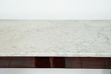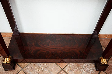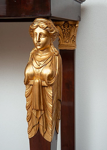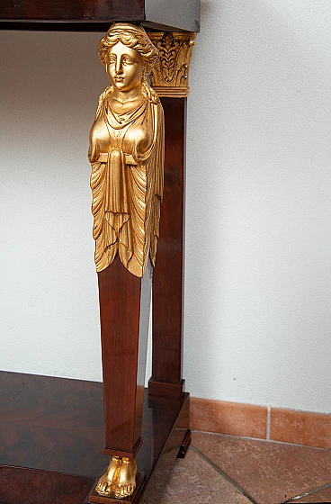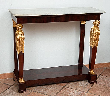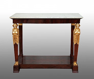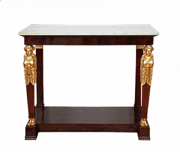 Antique French Empire console table belonging to the Consulate period of the early 19th century. The structure has a rigid rectangular shape covered entirely in mahogany feather with an oak interior and a white statuary marble top. The front is characterized by two caryatid-shaped pilasters in gilded wood terminated with feet, also gilded. The two rear columns end with Corinthian capitals in gilded wood. The base is rectangular in shape and rests on solid mahogany pad feet. Marble top is coeval. Restored by our master craftsmen using the traditional handmade shellac and alcohol method. Provenance France, early 19th century. Measurements 115 x 43 cm, H 100 cm. Certificate of Authenticity. We are at your disposal for further clarification or photographic details. Shipping throughout Italy, Europe and the rest of the world at very low prices, with maximum security and traceability. Shipping will be agreed privately. We wish you a good day.