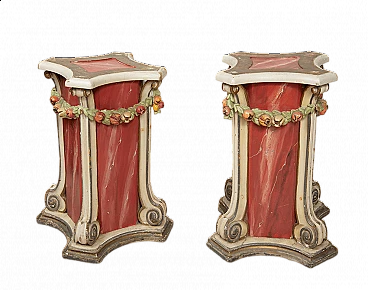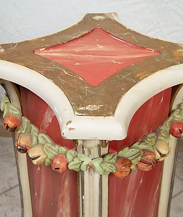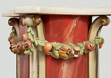 Pair of Venetian lacquered and gilded wood columns, early 20th century. The central marbled-effect shaft is surrounded by four ivory lacquered pilasters ending with introflected curl. Enriching the entire structure is a green garland consisting of racemes alternating with red pomegranates. Complete with certificate of authenticity.