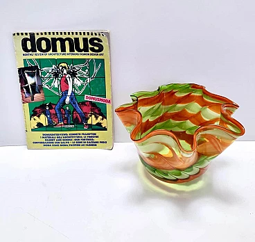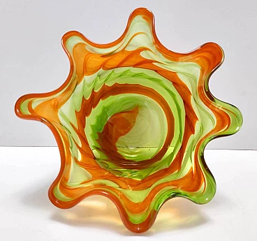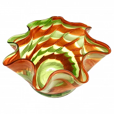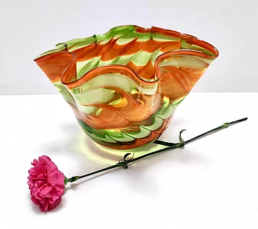 Fazzoletto vase in green and orange Murano glass by Fratelli Toso, 1980s