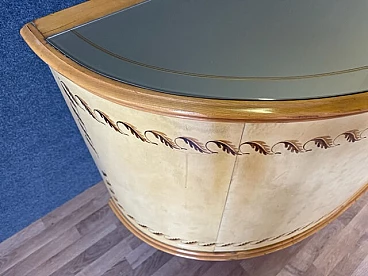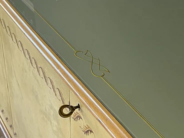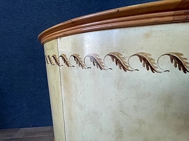 It has a half-moon-shaped front, is entirely covered with parchment and embellished with painted decorations with plant motifs. The inside is made of maple wood lightened by thread inlays and equipped with shelves; the first door on the right and the first one on the left have two drawer units inside.
