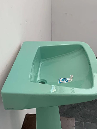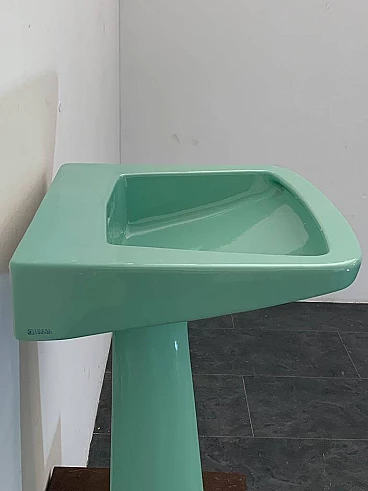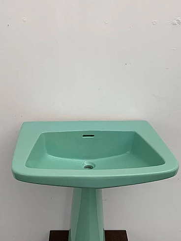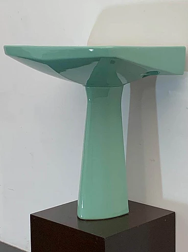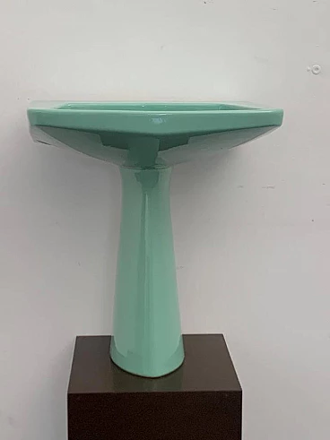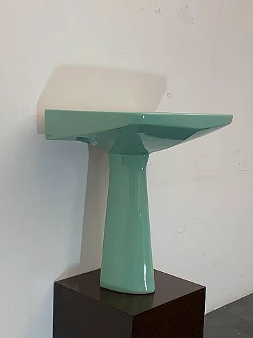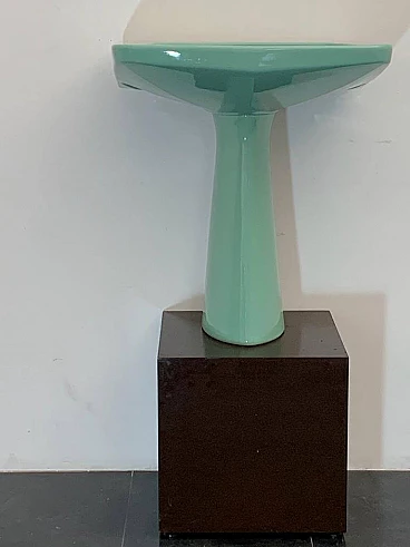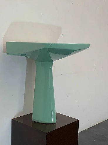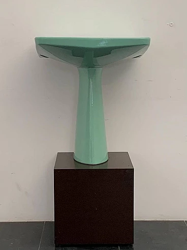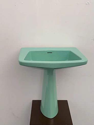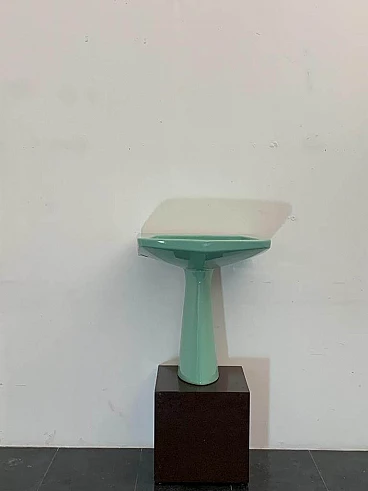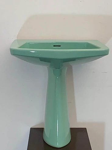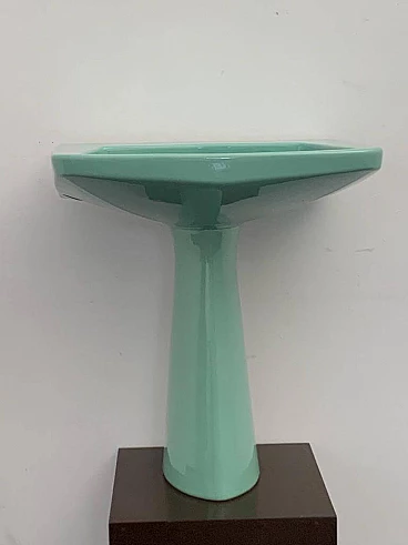 Sea green Oneline washbasin by Gio Ponti for Ideal Standard, 1950s (1953). Arrangement three holes or to put wall-mounted faucets. By removing the architectural garments from the appliances - the column pretending to hold the sink bowl, the raised collars belonging to the profiles - we arrive at the true form, Ponti says in '55, but he had already done so in '36 with the Deva fixtures for Montecatini. Here the sink column is a simple plinth that conceals, not holds. The smooth basin, without relief, is trapezoidal, a shape that favors the gesture of the arms during washing.