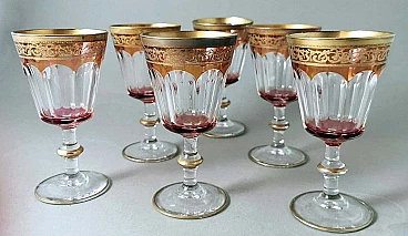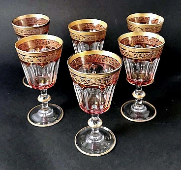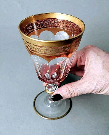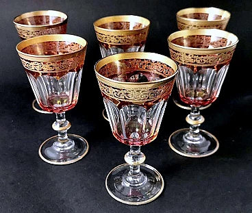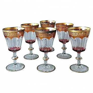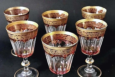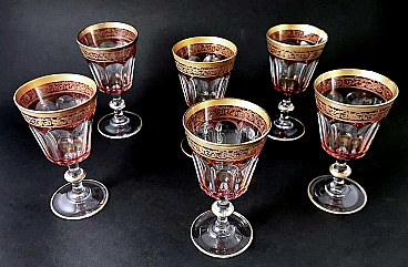 6 Blown and coloured wine goblets in Louis XVI style with gold rim, 1970s