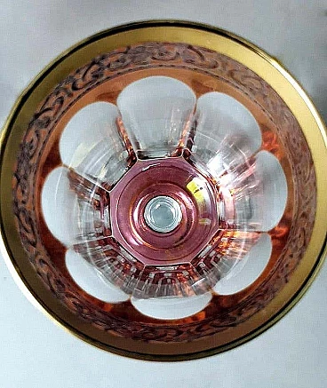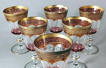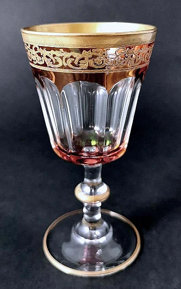 Refined and precious Italian wine goblets made of blown glass. The set consists of six pieces; the bowl of each glass was barrel-blown, then the craftsman manually fixed the stem and base by heat. When the glass had reached a low temperature, the master glassmaker spread a gold chloride pigment mixed with copper on the surface of the glass to obtain the soft red colour; while the glass was still at a low temperature, a fine gold rocaille pattern was applied to the rim using the gold leaf technique, laid on the surface of the glass coated with fondant. The decorator engraved the leaf with the desired pattern and removed the excess parts; a simpler gilding was also done on the edge of the base and on the shaping of the stem; then the craftsman fixed everything to the glass (colour and gold) indelibly by annealing in the furnace. Once the glass had completely cooled, it was ground and moulded into the bowl, removing the colour in the ground part to leave the transparency of the glass, thus creating a fascinating contrast. The glasses were created between 1970 and 1974 by master glassmakers in a small workshop in Montelupo (Empoli-Tuscany, Italy). We purchased the glasses directly from the glassworks, along with other objects that were part of the exhibition, shortly before the workshop closed in 1998. Empoli and its surroundings are a very important reality in the field of glass production in Italy. The various processing phases are economically important activities, involving numerous companies from small to large in the area. Of great importance is the artistic production of glass, both artisanal and blown, for furniture and tableware. The first glassworks was established in Montelupo, towards the end of the 18th century, and a few years later it was the turn of the first glassworks in Empoli. Later, between the second half of the 19th century and the first years of the 20th century, other glassworks sprang up, especially in Empoli, taking advantage of the new communication routes, which made it possible to transport the products made in various parts of Tuscany and Italy. The artisanal and manual technique in glass production in Empoli, combined with the ancient tradition, soon had a great commercial success and an enormous artistic-cultural impact that lasts to this day. The glasses are in excellent condition, in fact they were part of an exhibition, therefore never used. Size diameter 7 cm, height 14 cm. For all our shipments we use special packaging materials (custom-made wooden crates, polystyrene, etc.) for maximum protection and safety of the objects.