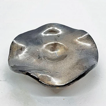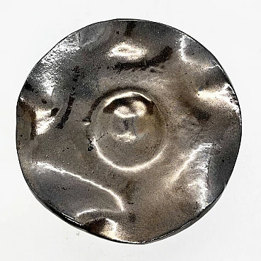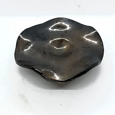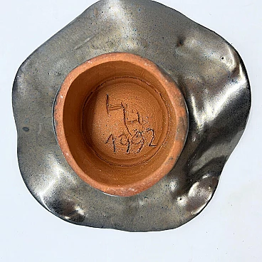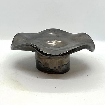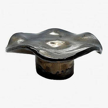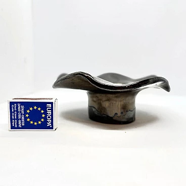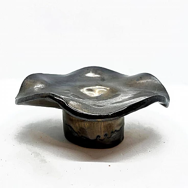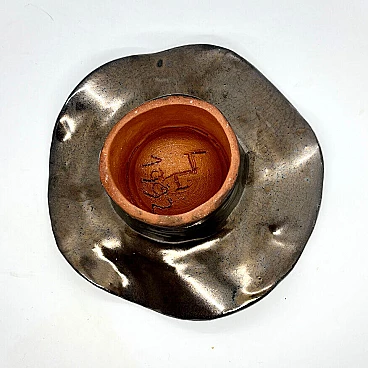 Interesting candlestick or small tray on a leg with an unconventional retro design. The surface of the candlestick is a shiny silver-black colour with drop glaze. The candlestick was made entirely by hand in a unique and very interesting shape and style. The item was produced in 1992 in the Czech Republic. The candlestick is in excellent condition, without damage. Clay article, signed on the bottom. Dimensions: height 7 cm; base diameter 7 cm; diameter 17 cm; entrance diameter 5 cm. Dimensions in inches: height 2.8 in|base diameter 2.8 in|diameter 6.7 in|inlet diameter 2 in.