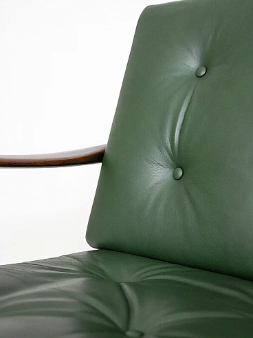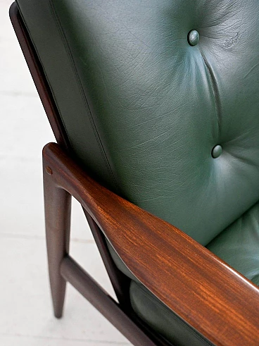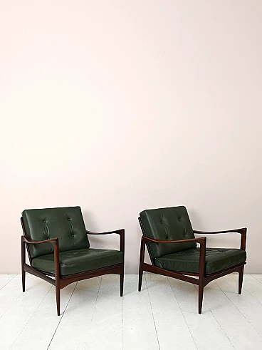 Pair of Kandidaten armchairs by Ib Kofod-Larsen for Ope, made in Denmark in the 1960s. Solid teak wood structure with essential and refined lines; dark green leather cushions original of that time and in good condition. A conservative restoration has been done. They may show signs of time.