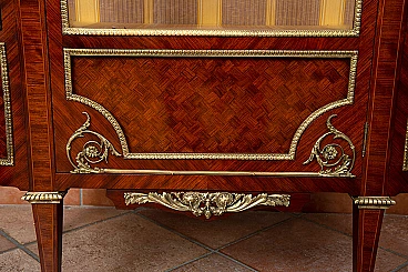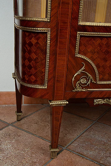 French Napoleon III showcase in exotic precious woods belonging to the second half of the 19th century. On the front, the door has an inlay with a geometric motif surrounded by a bronze frame with two glass shelves inside. The side panels have a convex shape and recall the same layout as the front. The underside band is richly adorned with finely chiselled gilt bronze applications. Provenance France (1880/90). Restored by our master craftsmen using the traditional method (shellac and rubbing alcohol). Measurements: 85x40 cm, H 167 cm. Certificate of Authenticity. We are at your disposal for further clarifications or photographic details. Shipping throughout Italy, Europe and the rest of the world at very low prices with maximum security and traceability. Shipping will be agreed privately.