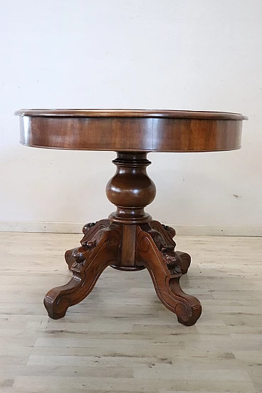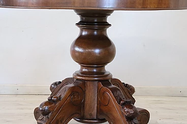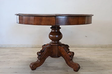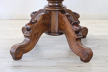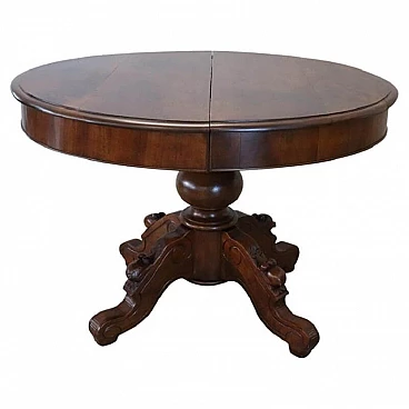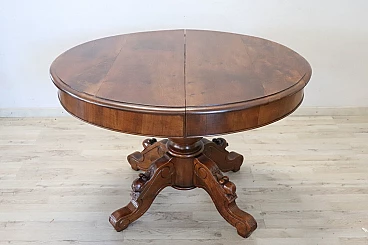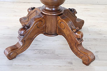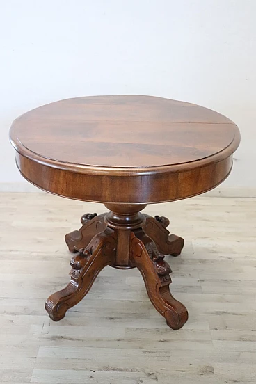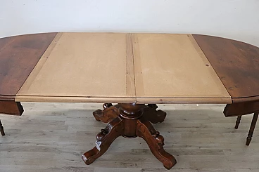 The large central leg is finely turned and carved. When the table is open, two small turned legs on each side descend and provide stability for the table. The two central leaves that serve to extend it have been left in unfinished wood and can be walnut-stained at the customer's request.