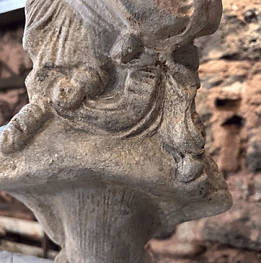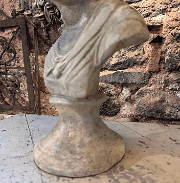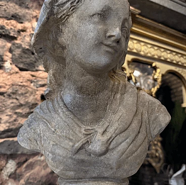 Terracotta bust sculpture of a young girl, handcrafted in Sicily in the first half of the 20th century (about 1930s). It has original patina with signs of use and age. The chosen subject reflects ideals of youth and innocence. The original patina on the sculpture indicates the natural aging process of the terracotta over time. It may have acquired a weathered appearance due to exposure to the elements or the environment in which it was displayed or stored. Patina manifests itself as discoloration, texture or a worn surface and contributes to the overall aesthetic appeal and historic appeal of the sculpture. Signs of use and age, such as small chips, cracks or scratches, are common in ancient terracotta sculptures; these blemishes may have occurred from handling, movement or wear over the years.